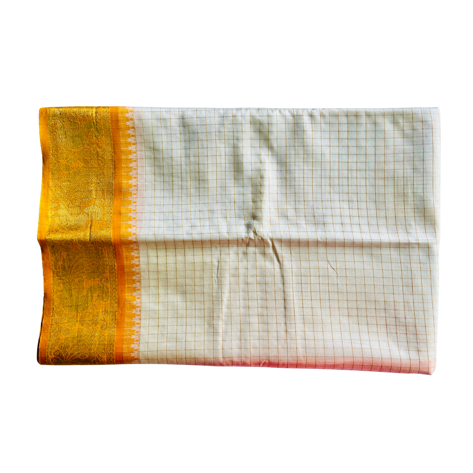 Madurai Pattu - Cream Madurai Silk Saree with Golden Yellow Border and Peacock Motif Design
