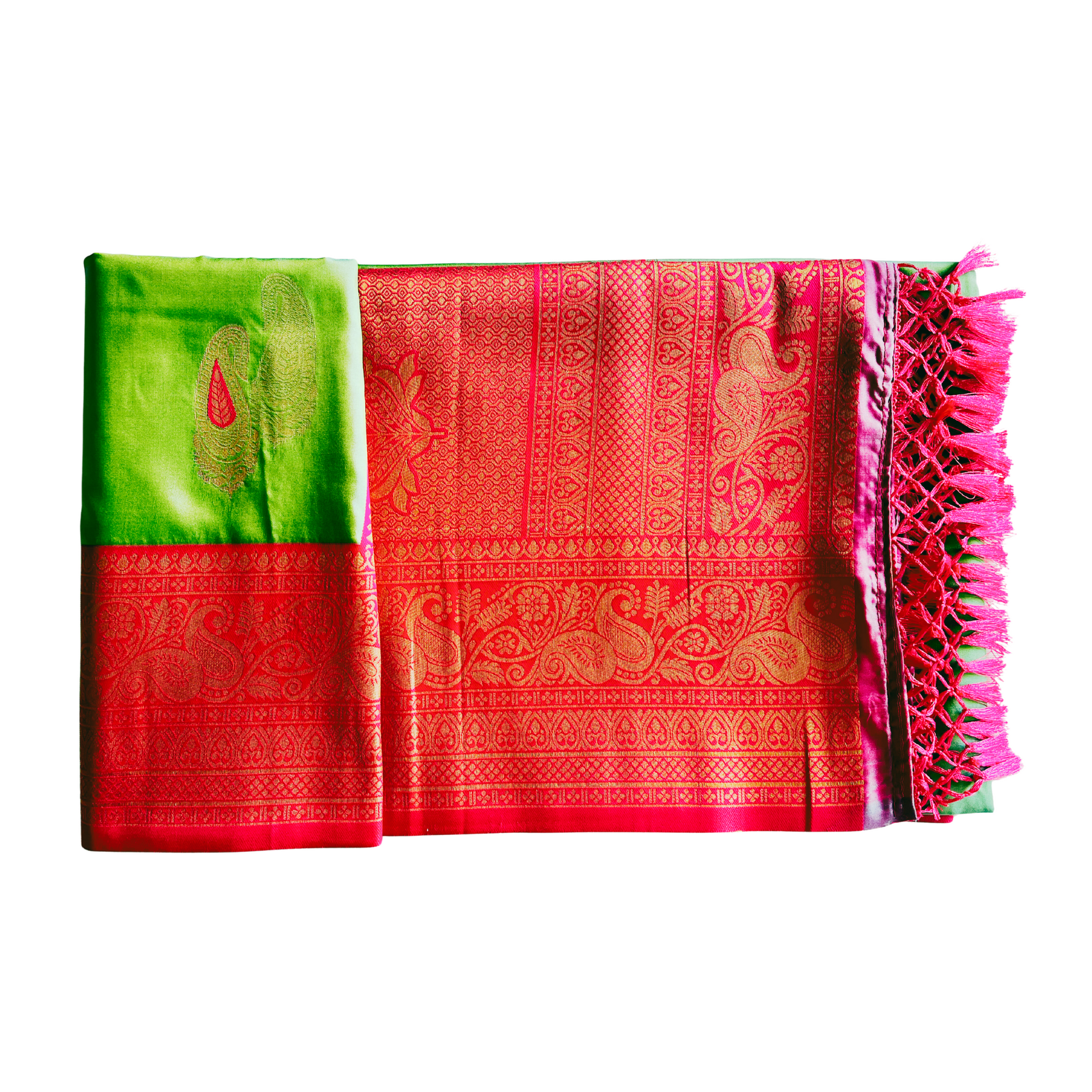 Parrot Green Silk Saree with Vivid Pink Border and Heavy Pallu Weave Design